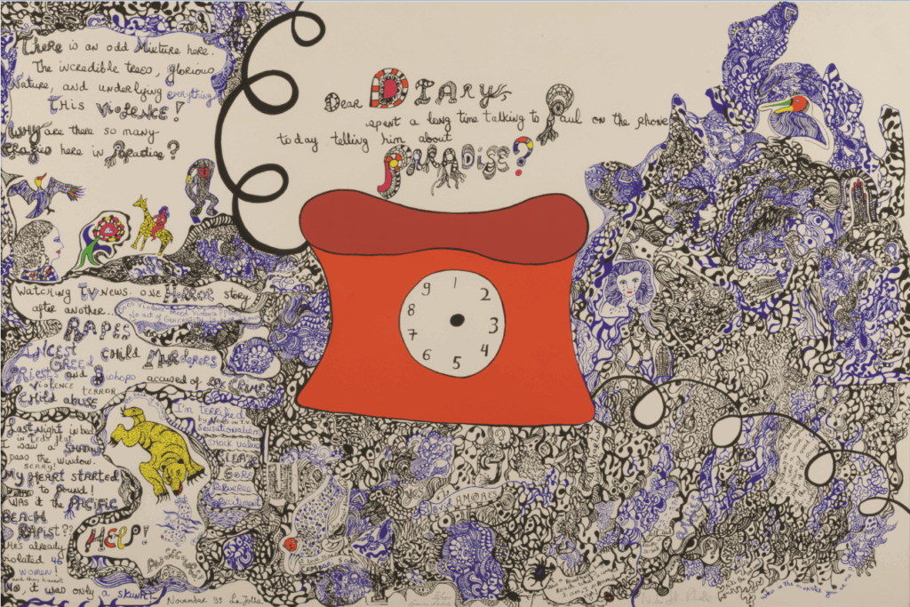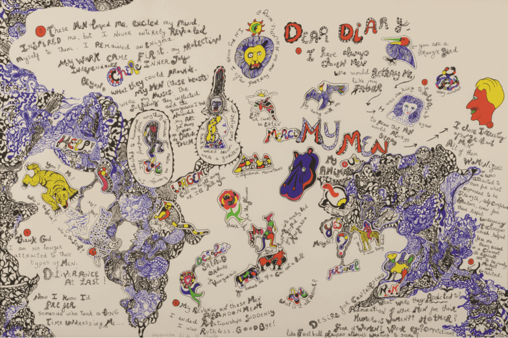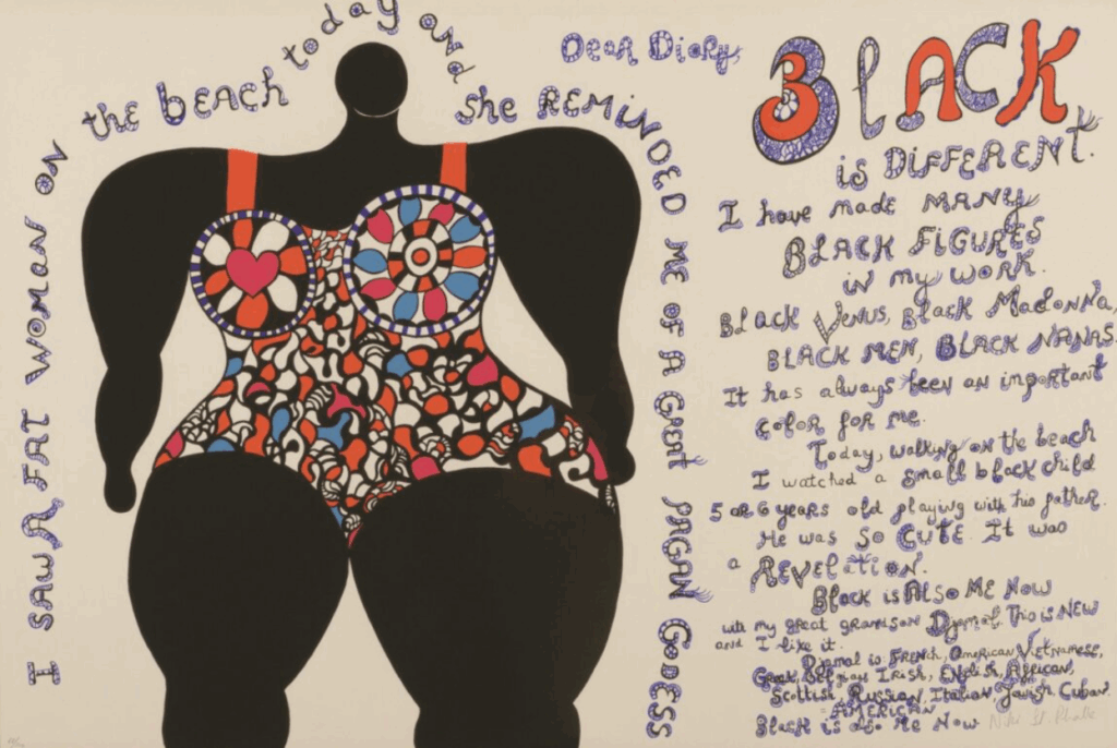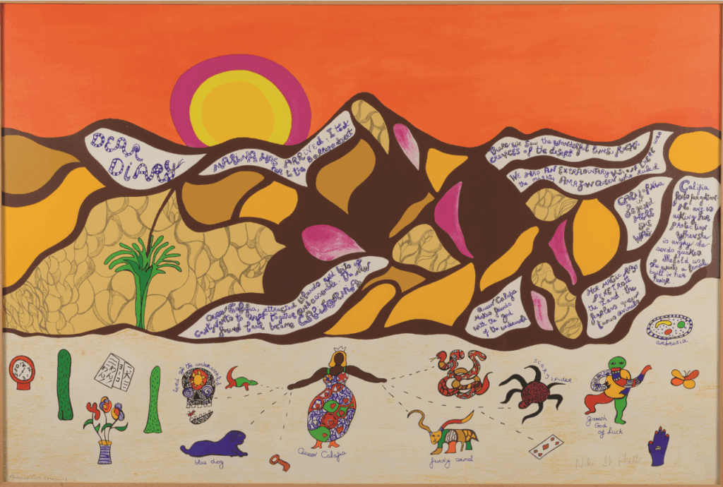 Nesse diário, Niki misturava memórias pessoais, figuras de sua obra — como cobras, aranhas e as Nanas — e impressões sobre o lugar onde viveu: as paisagens, as pessoas, o estilo de vida… mas também reflexões sobre violência, racismo e desigualdade, temas que a atravessaram profundamente por ter uma família multirracial.