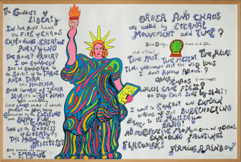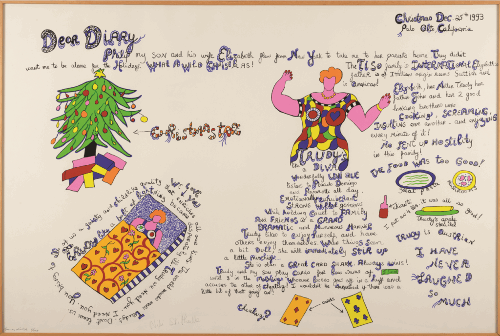 Aos 60 anos, Niki de Saint Phalle reinventou sua arte na Califórnia. Em 1993, ela iniciou o seu Diário da Califórnia: um registro visual intenso e colorido dos seus dias, cheio de desenhos, relatos e serigrafias que revelam tanto encantamento quanto inquietações.