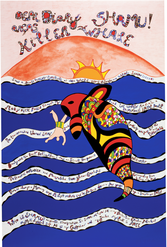 Niki de Saint Phalle comparou essa criatura magnífica e cativante ao seu próprio potencial criativo destrutivo. Traçou linhas evocando ondas — mais próximas do oceano do que de uma piscina limitada — e dentro delas escreveu: “Quem é Shamu? Enigmático, forte, estranho. Shamu sou eu? Não! Ele é meu potencial criativo destrutivo, meu eu metafísico. Ele é meu guardião e meu carcereiro, meu elo com o destino.”